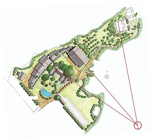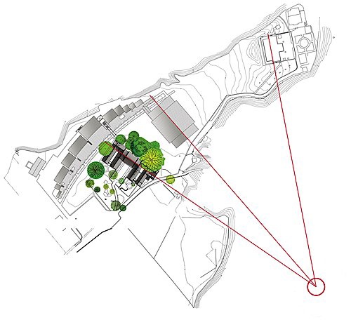 所以在進行全區配置時,我們先利用兩個主要屋脊的延伸線交點作為圓心,以此得到新禪堂的屋脊線,並順勢將新護龍沿著邊坡退縮設置,很快就得到一個弧形的配置方案,感覺非常簡單扼要,功能與量體也非常合理,然而這樣的配置畢竟與之前的提案大異其趣,讓我們一度非常猶豫,因為不管多麼的順應地形或是多麼的具有數學邏輯,法鼓山的僧眾能夠接受嗎?他們會同意在這裡設置一個弧形的護龍嗎?沒想到在令人揣測不安的第一次會議中,這個提案竟然通過了,包含聖嚴法師在內的與會人員,幾乎都認同了我們的觀點,這種順利更加鞏固了我們原本的信念:此處的新建築應該扮演背景的角色。
