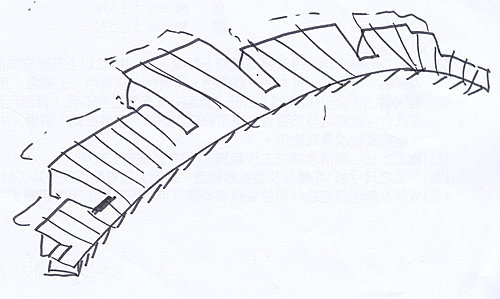 初次拜訪齋明寺時,確實可以感受到該寺小巧且順勢而建的特質,在看過全區測量圖之後,這種印象更加深刻,如果仔細觀察,會發現齋明寺與萃靈塔的屋脊線,幾乎皆與所在位置的等高線平行,顯然前人興築之時,並未過度破壞原始地貌,是以這兩個不同年代興建的建築物,順著地形自然呈現約45度的夾角,然而之前的設計提案,大多將現有大殿的中軸線奉為圭臬,直接據以發展成矩形院落,套入不算方整的地形之後,新建築與邊坡明顯呈現緊張氣氛,而非齋明寺原本具有的小巧與從容,也無法跟萃靈塔繼續產生對話關係。
