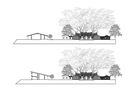 法鼓山賦予我們相當的設計自由度,然而我們也沒打算把這裡當作形式操練場,從一開始我們就非常清楚,這裡最該小心的,是尺度與新舊關係,外觀與造型只是處理完所有重要議題之後的自然結果,所以在後續的發展中,除了滿足僧團的空間需求外,我們一直試圖在三合院與陡峭邊坡之間找出一個合理的緩衝空間,讓老建築的小巧與精緻繼續存在,新建築則盡量以單純與低調的背景量體出現,因此在面對三合院側,我們設置了高度均一的屋簷與長廊,廊側設有寬度均一的遮陽板兼視線障板,而面對山谷側的建築量體則順應邊坡形狀以及空間機能而深度不一,使得屋脊的位置與高度也跟著改變,如此一來,新護龍的屋脊即使高達10米也不會被輕易發現,重返齋明寺的遊客也許較能適應,基於同樣的理由,在處理現有植栽時,我們也盡量調整建築量體以保留一些重要植栽,尤其在設計新舊建築的連通廊時,為了避開一棵歷史悠久的龍眼木,還特別轉了幾個彎,只可惜龍眼木在施工期間被業主逕行移走,徒留彎廊讓人納悶。