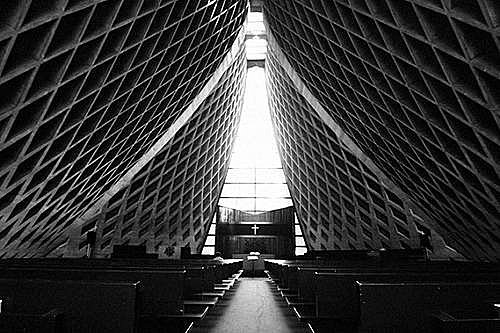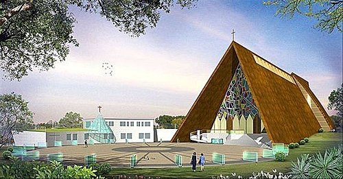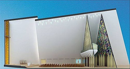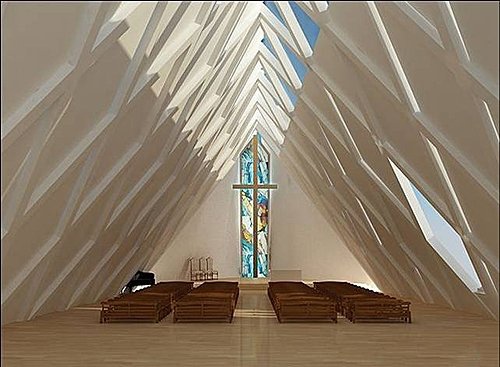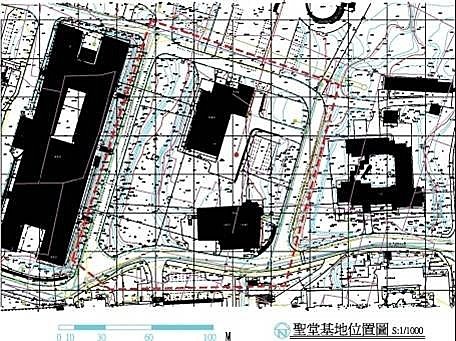 不知道大家看到這三張圖片之後,會不會聯想到什麼?會不會覺得跟東海那棟很有名的建築物很像?唯一比較不同的是,這棟教堂將要蓋在有著十一公尺高低差的山坡地上。