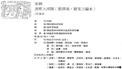 大約是民國七十三年的暑假,當時任教於中原及東海大學建築系的林會承老師,配合台北市立美術館的展覽活動,找了兩校的學生合力製作了「大觀園」與「清明上河圖」的繪本復原以及局部模型製作,記得當時整個暑假加上開學後近一的月,中原與東海的同學都在忙這件事,其中包含畫圖的、做模型的、上色的、刻人的,忙得暈頭轉向,忙得很愉快,而最後在展場呈現的模型品質也實在超乎想像,包含瓦片的質感、牛車以及類似朱銘風格的木雕人偶,很多人一定不敢相信這樣的作品出自學生之手。