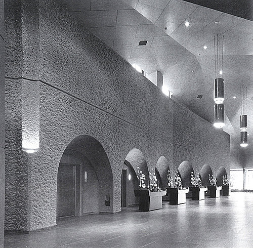 近代日本建築大師楨文彥的〝風之丘葬齋場〞是一個近年來備受國際矚目的殯葬設施作品。楨文彥的作品素受日本與西方建築界推崇,被尊稱之為「精緻的現代派」,在許多個案中,常能運用精緻的現代材料或是現代工法來展現古樸風格或是具有強烈文化色彩的複合印象,本案自然也不例外。風之丘葬齋場位於日本國大分縣中津市,於1997年2月落成啟用,設計概念除了具備日本人對於人性的一貫尊重外,在空間氛圍上則充分反映了建築之美與傾圮(象徵死亡)的無奈,以及建築師對於生死大事的深沉思考,園中雖然未見日本傳統建築的形式特色,但卻處處充滿和式建築的安祥與寧靜,包含精心安排的使用動線與爐前空間。主要的空間特色來自一條故意拉長呈曲折狀的主要通道,該通道銜接了禮堂與火葬場,途中佈滿了從上方灑下的光線與陰影,時而明亮時而幽暗,時而開朗時而傷感,豐富的空間表情除了暗示生命之不可知與死生契闊的難捨之情外,詩性的空間特質也使得喪家能在喪親的痛苦中感受到一些安慰與體貼,若說人性空間為何,想必這就是最佳的例證。
